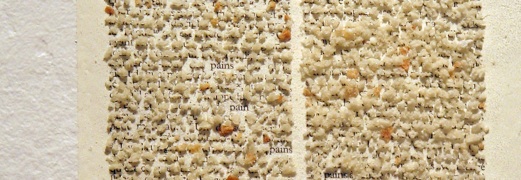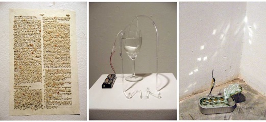 Une petite pompe électrique placée dans le verre de vin, propulse l’eau dans un tube sculpté écrivant le mot ‘vin’. Le flux d’eau est transformé en ‘vin’ continuellement et se retransforme en eau à son arrivée dans le verre. Au mur est affichée une page de l’évangile de Jean où chaque caractère, à l’exception de ceux formant le mot ‘pain’ sont occultés par une miette de pain. Plus loin, un petit alevin flotte au dessus d’une boîte de sardines ouverte, tapissée de miroirs.